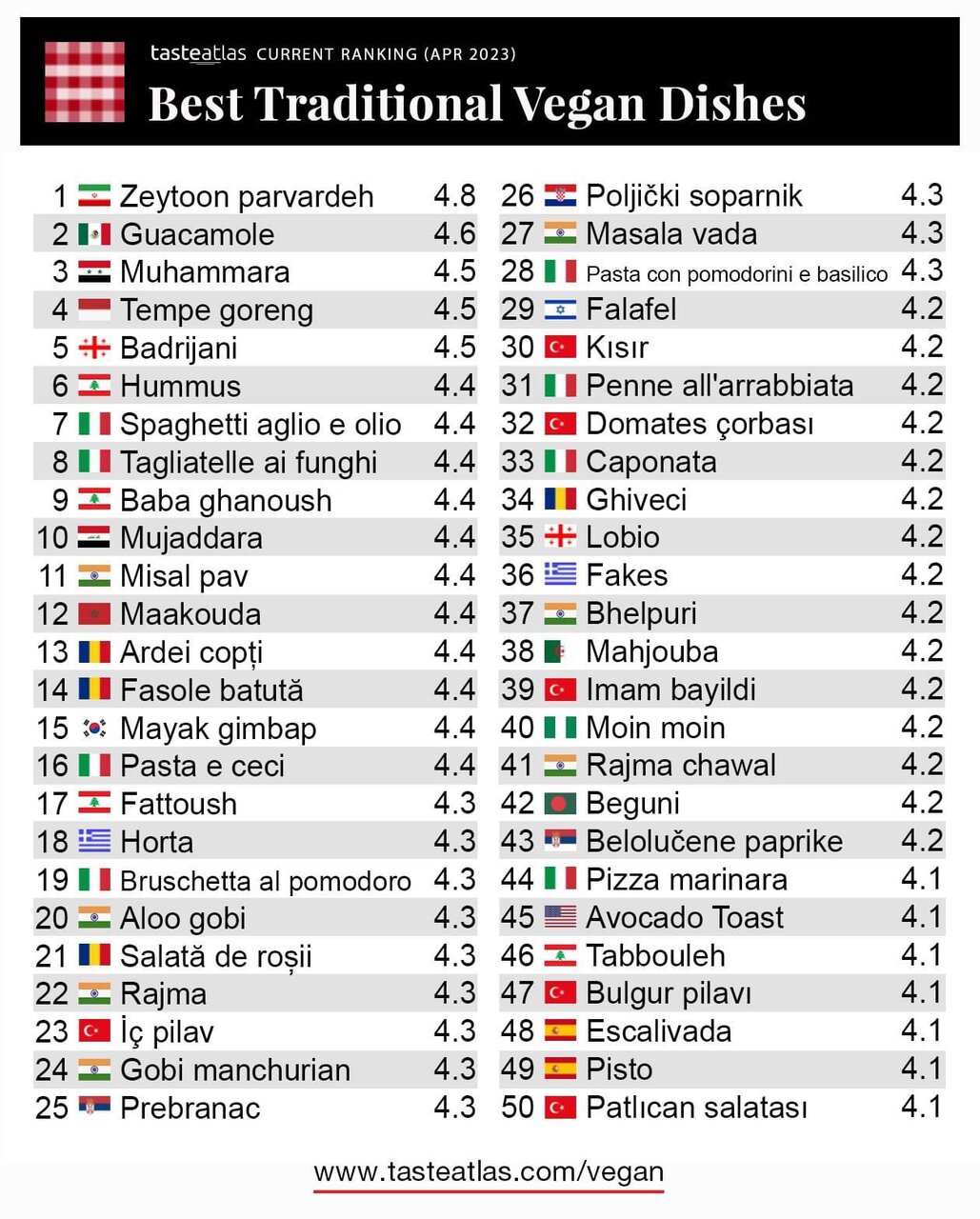 ظاهرا برای فهرست «۱۰۰ بهترین غذای گیاهی با رتبه بندی در جهان» تا ۲۴ آوریل ۲۰۲۳، ۹۷۴۰ رتبه بندی ثبت شد که از این تعداد ۶۱۰۷ مورد توسط سیستم به عنوان قانونی شناخته شدند.